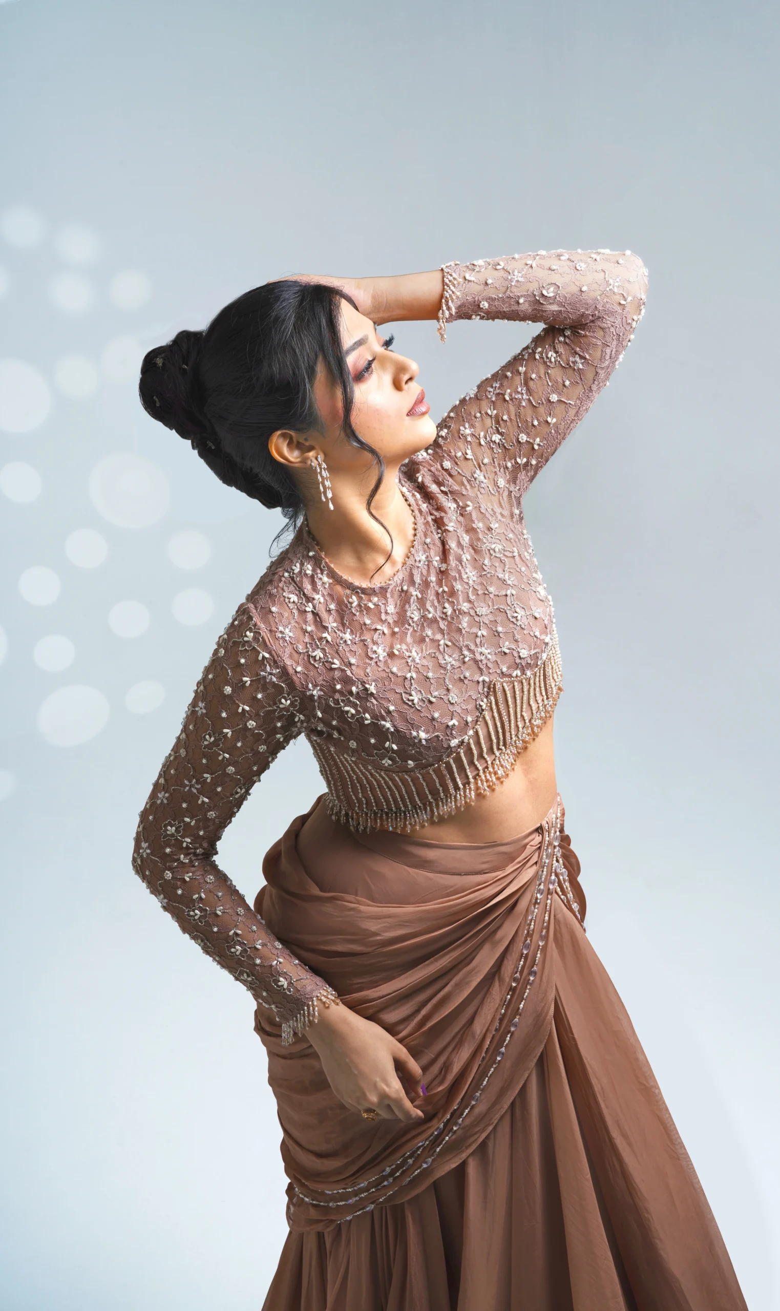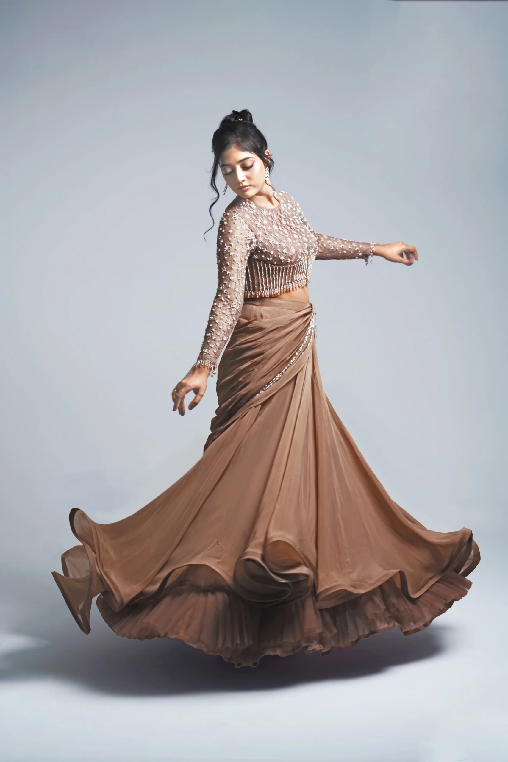 • Adorned with intricate hand-embroidery in pearls and crystals, creating a soft shimmer with every movement.